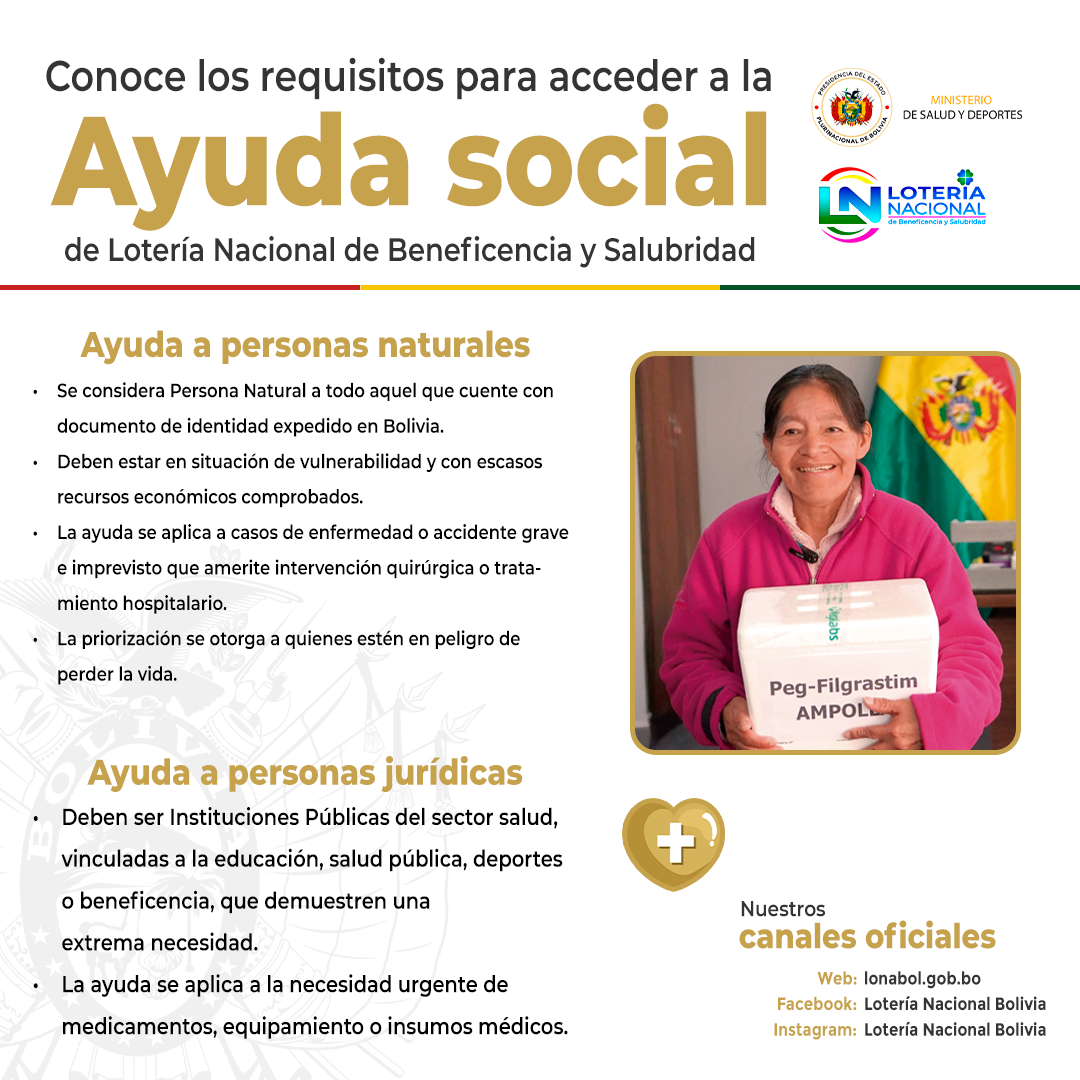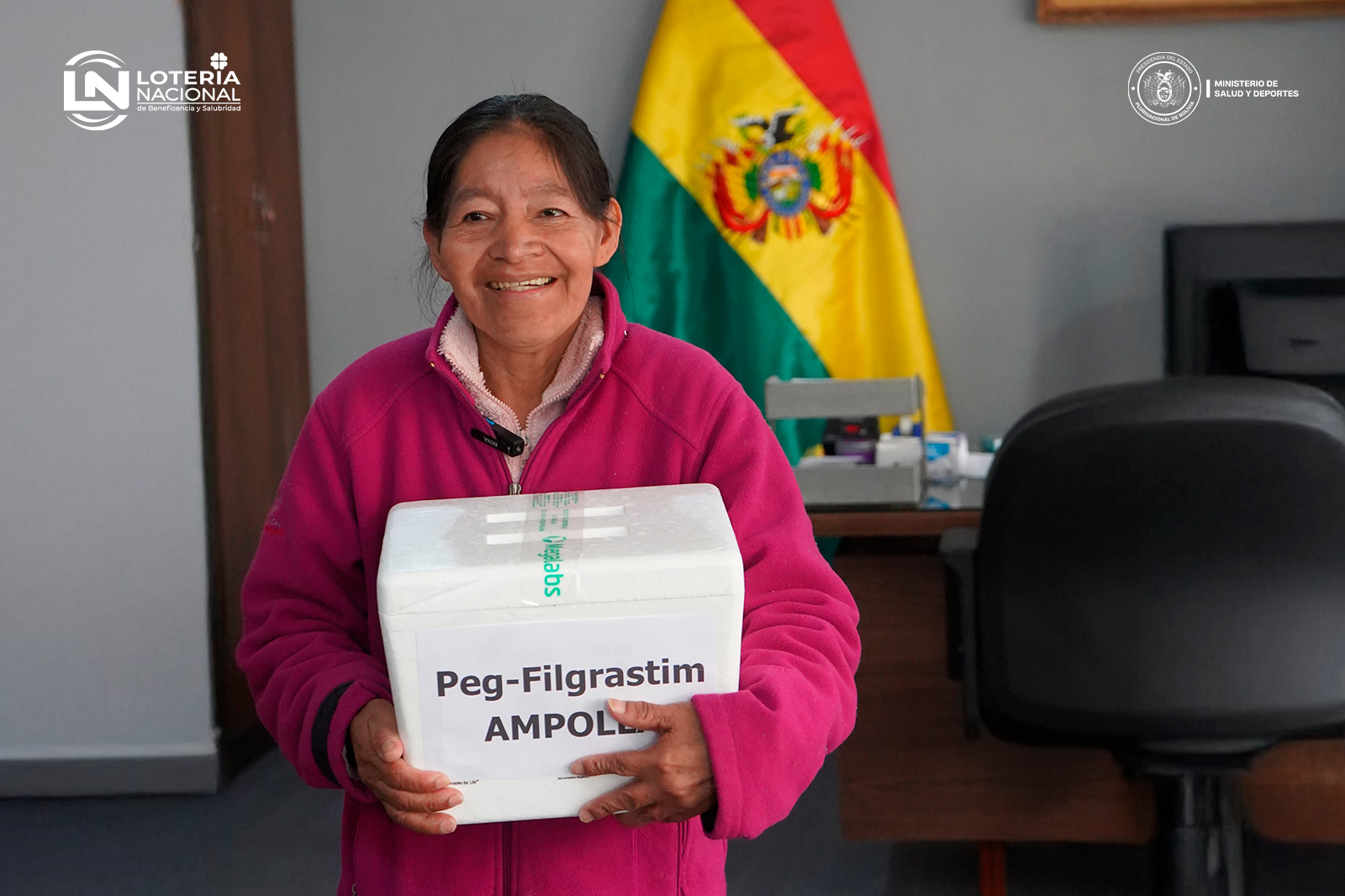 La Lotería Nacional de Salubridad y Beneficencia, bajo tuición del Ministerio de Salud y Deportes, entregó una dotación de fármacos a la Sra. Isidora Arminda Quispe Mamani, con diagnóstico de cáncer de cérvix escamoso queratinizante infiltrante....