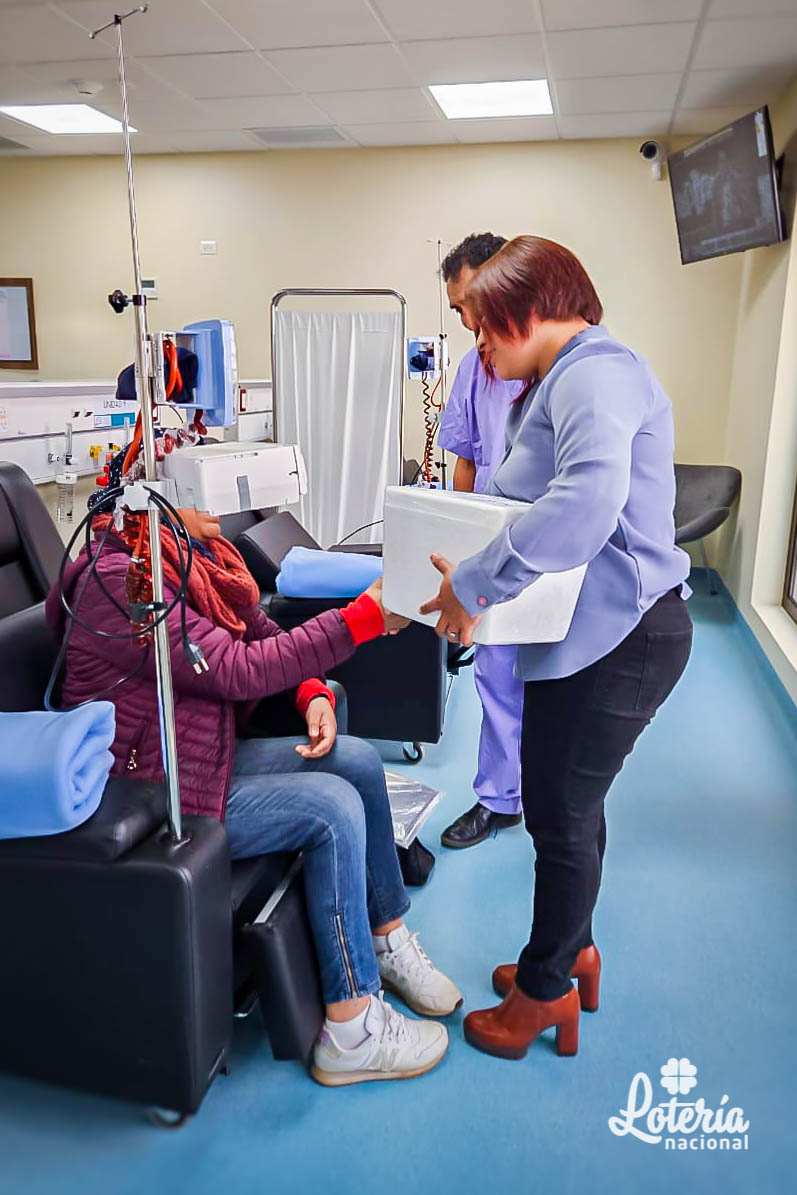 Paciente de escasos recursos logrará vencer el Cáncer de Cuello Uterino gracias a la Lotería Nacional. En un significativo acto solidario la Máxima Autoridad Ejecutiva de la Lotería Nacional de Beneficencia y Salubridad, Lic. María Nélida Acuña hizo efectiva la entrega de insumos médicos como ser Bevacizumab de 400 mg. y Bevacizumab de 100 mg. a la Sra. Alicia Vilma Aguilar quien padece de Cáncer de Cuello Uterino, estos medicamentos permitirán dar continuidad al sexto ciclo del tratamiento de Quimioterapia, realizado en el Centro de Medicina Nuclear y Radioterapia - Agencia Boliviana de Energía Nuclear de la ciudad de El Alto, departamento de La Paz.